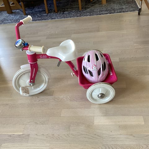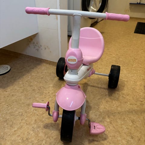 Smoby trehjulssykkel med 10" hjul i rosa farge. Sykkelen har tre hjul for stabilitet, styre med håndtak og sete med ryggstøtte. Den har fotstøtte bak og pedaler på forhjulet. Egnet for små barn som skal øve på balanse og tråkking under tilsyn av voksen.