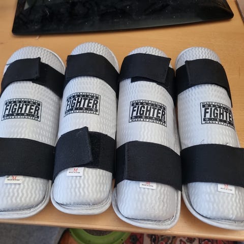 Mooto leggbeskyttere for taekwondo i størrelse S. Modellen er svart med elastiske borrelåsstropper for justering og feste rundt leggen. Beskytterne er merket med WTF-godkjenning og CE-merking. Egnet for bruk til taekwondo-trening og konkurranse der godkjent leggbeskyttelse kreves.