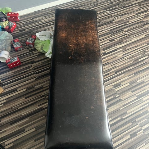 Pent brukt entremøbel - benk med kurver og beige pute. Lav og nett benk som passer fint i en liten entre.