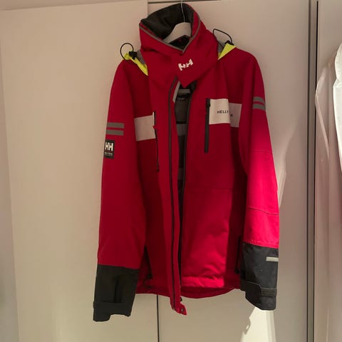 Helly Hansen seilerbukse i størrelse XL, regular passform. Buksen er rød med kontrastfelt og refleksdetaljer, og har seler for justering av passform.