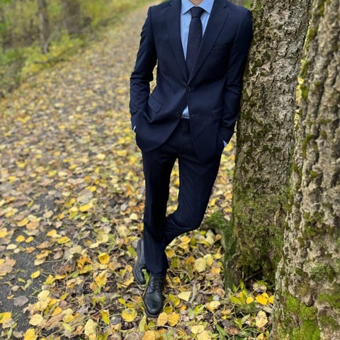 Jakke str.46 og bukse 30/32. Slim fit. Skjorte str S medfølger.