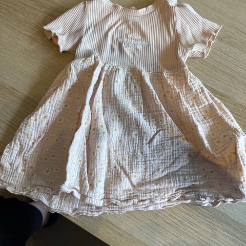 MINI A TURE kjole for jente i størrelse 104. Kjolen er rosa med mønster og har korte ermer. Den er laget av bomull (100 %). Kjolen har innsvinget liv og knepping bak.