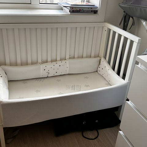 Sprinkelseng i tre, lett i vekt og enkel å flytte. Har tre justerbare høyder. Den er i god stand, med noen få bruksmerker. Sengekant og tykk madrass fra Yngri kan følge med om ønskelig.