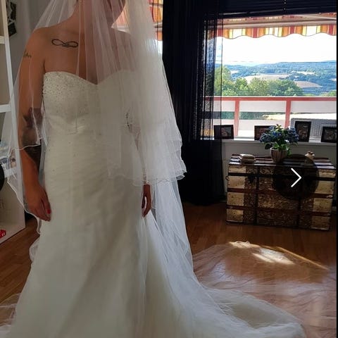 Selger en nydelig, skreddersydd brudekjole med vakre blondedetaljer og tilhørende slør. Kjolen er figurnær med et elegant fall og små blondeermer som gir et romantisk og tidløst uttrykk 🤍