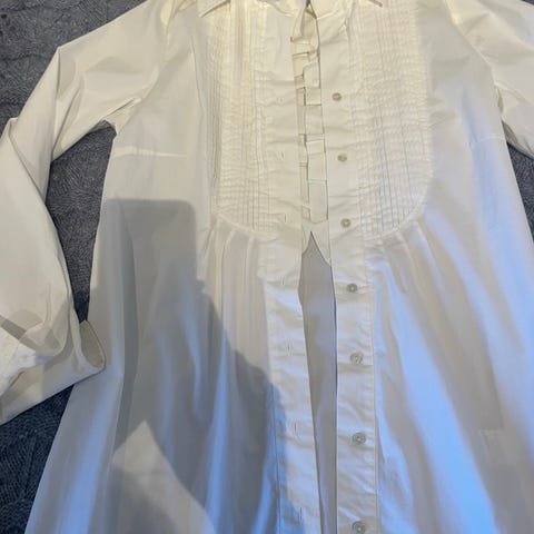 Armani Jeans bluse for dame i størrelse M. Blusen er hvit og laget i bomull. Den har kort erm, åpen front med volangkant og et diskret rutemønster i stoffet. Passer som lett overdel til hverdagsbruk eller til mer pyntede anledninger.