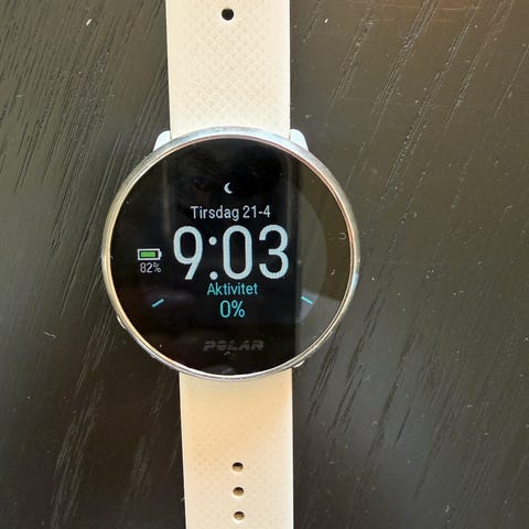 Polar Vantage M pulsklokke med hvit silikonreim. Klokken har rundt display og optisk pulssensor på undersiden. Laderen medfølger, med magnetisk ladeplate og USB-tilkobling. Kan brukes til det aller meste av trening og aktivitetsregistrering. Har vært en kjempeklokke, men har nå oppgradert til en nyere versjon.