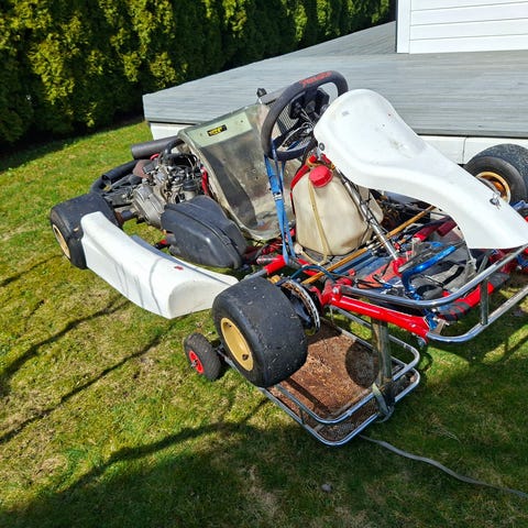 En gammel enkel gokart, med ett kult glassfiber karosseri i NASCAR stil.