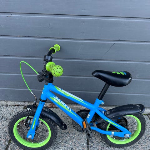 Barnesykkel med 12" hjul i blå/grønn farge. Vært brukt som første sykkel til vårt barn i 1 sesong. Noe bruksmerker som vist på bildene. Ubrukte støttehjul kan medfølge om ønskelig.