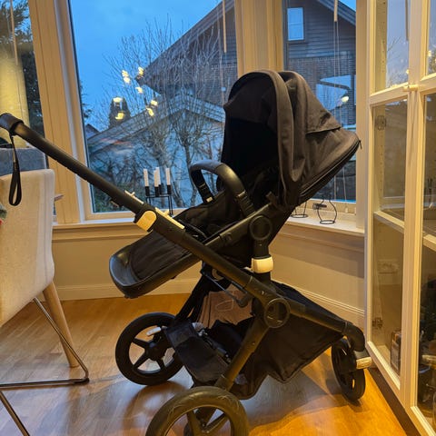Bugaboo barnevogn i svart farge. Vognen har liggedel og sittedel, justerbart håndtak og varekurv under setet. Sittedelen har fempunktssele og avtagbar frontbøyle. Egnet til bruk fra nyfødt med liggedel og videre som sportsvogn når barnet blir større.