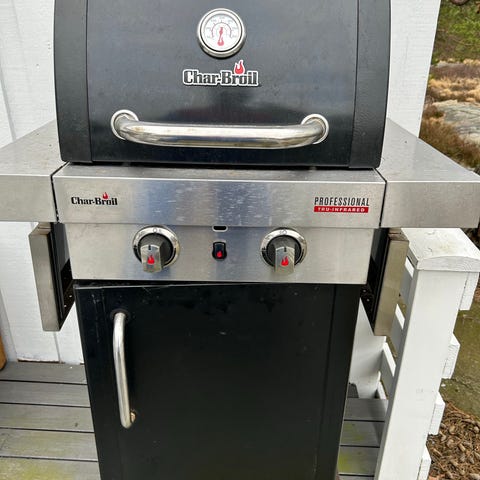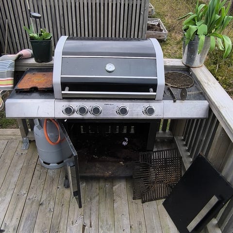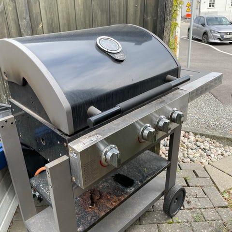 Gassgrill med lokk og to sidebord. Grillen har brenner med separat kontrollbrytere på frontpanelet. Egnet for utendørs bruk på terrasse eller i hage. Tenneren virker ikke, så gassen må tennes manuelt. Gassbeholder følger ikke med. Trenger en god skrubb.