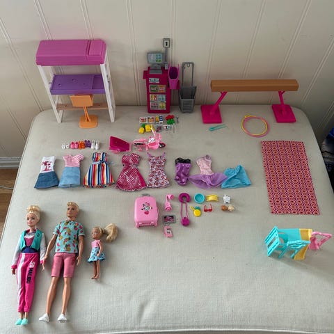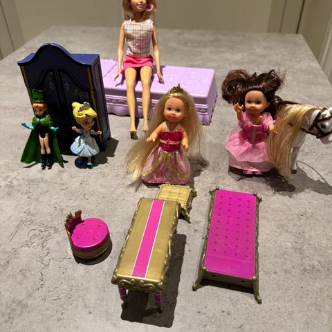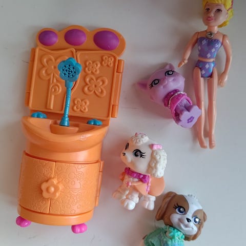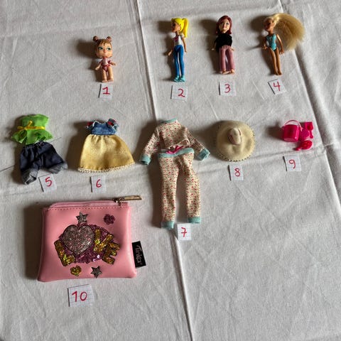 Polly Pocket dukker med tilhørende møbler og tilbehør. Pakken inneholder flere små dukker samt trerelaterte møbler som seng, nattbord og garderobeskap, i tillegg til en mindre seng med sengetøy og små figurer. Settet egner seg for lek med dukkehus og rollelek i mindre skala. Alle deler er i liten størrelse tilpasset Polly Pocket-figurer.