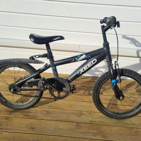 Alprace barnesykkel 16" i svart med blå detaljer. Sykkelen har 16-tommers hjul som passer typisk for barn rundt 4–6 år.