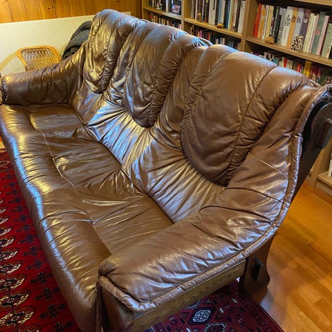 Sofagruppe skinn med treverk 3-seter 2-seter, 2 lenestoler burgunder og bord