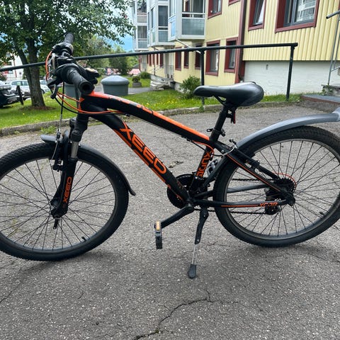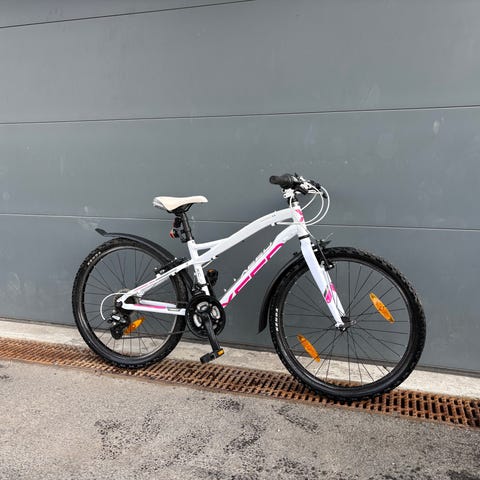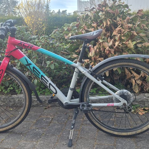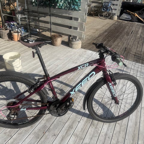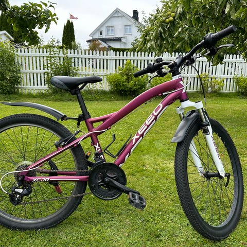 Xeed XCR JR 24 barnesykkel med 24" hjul. Sykkelen har lett ramme tilpasset barn, flat styretype og girsystem med flere gir. Fargen er lilla med kontrastdetaljer. Modellen passer til barn som har vokst ut av mindre barnesykler og trenger en sykkel med 24-tommers hjul for bruk på vei og lett grus. Sykkelen er utstyrt med skjermer og støtte.