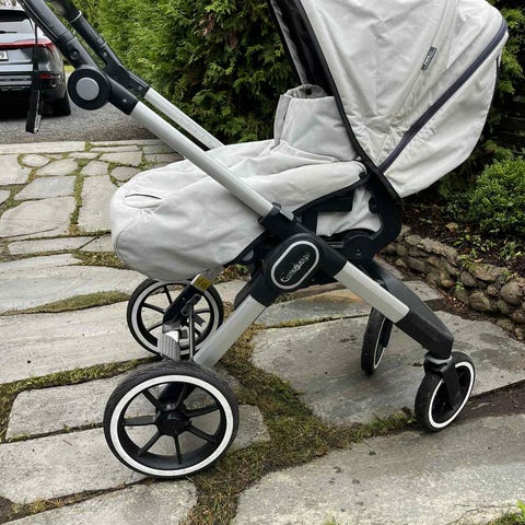 Medfølger adapter til nyfødt bilstol og regntrekk. Vognen har integrert myggnetting og solskjerming.