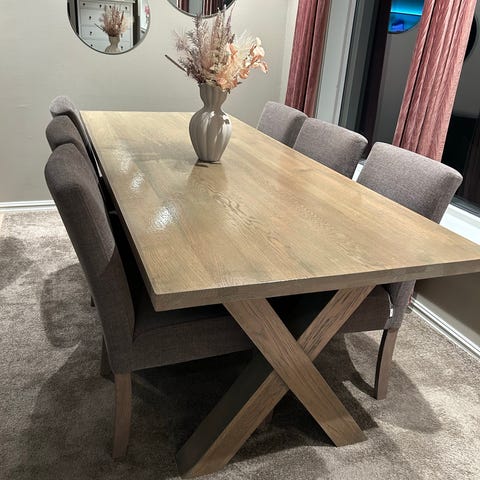 Nobel spisebord fra Fagmøbler, med to ileggsplater. Kjøpt i 2021, og er pent brukt siden. Det følger med to illegsplater, som alene kostet rundt 4000 per før. Siste bildet er med én ileggsplate. Med to blir bordet 2 meter langt.