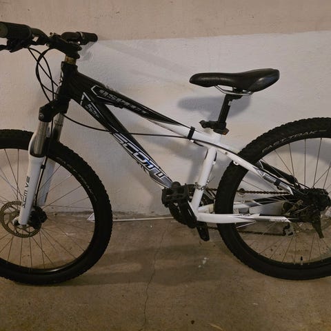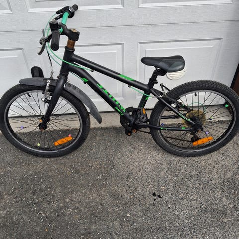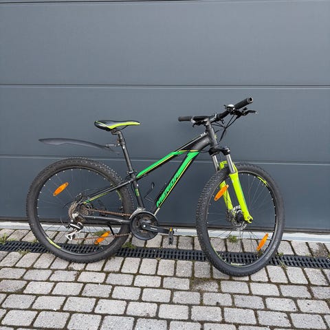 Barnesykkel terrengsykkel med 24" hjul i svart/grønn farge. Sykkelen har dempegaffel foran, hydrauliske skivebremser og 21 gir.