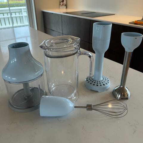 OBH Nordica stavmikser med tilbehør i hvit farge. Settet består av stavmikserhåndtak, avtakbar mikserstav i metall, visp, hakkerbolle med knivinnsats og lokk, samt høyt miksebeger.