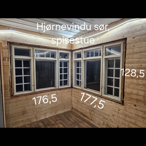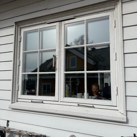 Gammelt trefags sprossevindu med tilhørende varevindu og ramme selges. Det er hvitmalt, og målene er 150 x 90 cm.