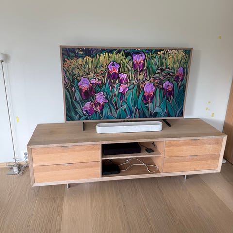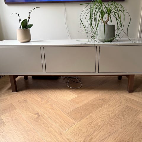 Pent brukt original grå mediebenk i Stockholm kolleksjon med valnøtt ben. Hull til ledning til TV i hyllen. Fremstår pen med lite bruksmerker.