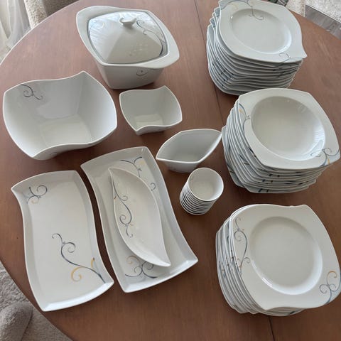 Hadeland Glassverk servise i hvitt porselen med dekor av grønne påfuglfjær. Serviset består av både runde og firkantede tallerkener i ulike størrelser, samt skåler og to små serveringsdeler formet som påfugler. Dekoren går igjen på alle delene, med fjærmotiv i grønt, blått og gull. Egner seg til servering av middag, forretter, dessert og tilbehør.