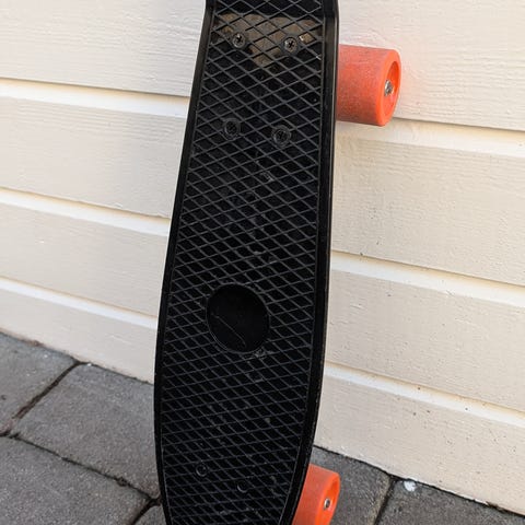 Skateboard i plast med svart brett og gule hjul. Kompakt størrelse som egner seg godt til cruising og kortere turer på jevnt underlag. Mønster på oversiden gir bedre fotfeste. Passer til brukere som ønsker et enkelt og lett brett til hverdagsbruk. Den er ikke så mye brukt. Den er nesten som ny. Passer til barn