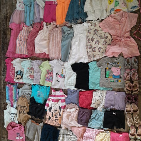 Liten klespakke for jente i størrelse 116 i flerfargede varianter. Pakken inneholder ulike plagg som kjoler, skjørt, shorts, t-skjorte og tights i flere mønstre og farger. Klærne passer til hverdagsbruk og kan kombineres på ulike måter. Materiale er hovedsakelig tekstil egnet for barneklær. Størrelse og passform er tilpasset jente ca. størrelse 116.