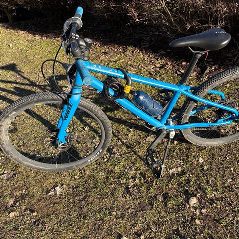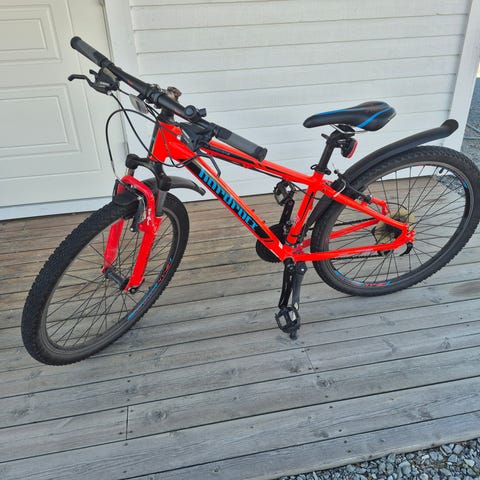 Barnesykkel med 24" hjul. Sykkelen har oransje ramme og dempegaffel foran. Nypris ca. 4000,-