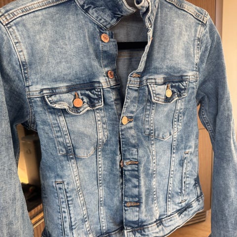Blå olajakke fra Topshop i størrelse 40. Denim. Moto olajakke for dame i størrelse 40. Fin som både ytterjakke og som lag over andre plagg. For liten til med desverre, så derfor svært lite brukt.