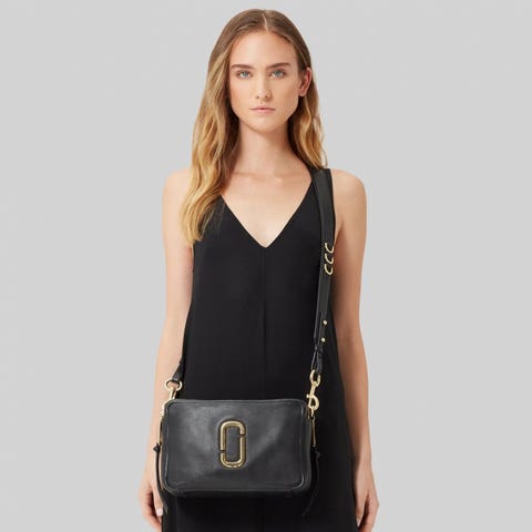 Marc Jacobs Snapshot skulderveske i svart lær for dame. Vesken har rektangulær fasong med karakteristisk metall-logo i front og justerbar skulderrem. Den består av to hovedrom med glidelås, samt et åpent rom på baksiden for enkel tilgang til småting. Innvendig er det flere mindre lommer som gir oversiktlig oppbevaring av nødvendigheter som mobil, nøkler og kort.