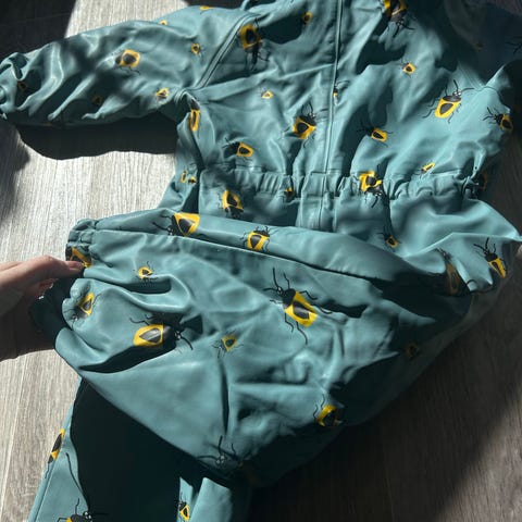 Kattnakken regndress for barn i størrelse 104. Regndressen er i grå farge med mønster og er laget for unisex bruk. Hel glidelås foran, hette og strikk nederst på bena. Materialet er vanntett ytterstoff egnet til bruk i vått vær. Enkel å ta av og på, og passer til lek ute i barnehage eller skole. Eventuell slitasje eller merker på stoffet bør kontrolleres nærmere ved kjøp.