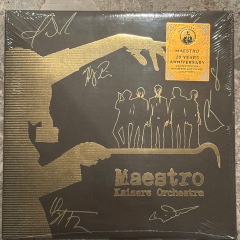 Kaizers Orchestra Maestro vinylplate i gull fra 20 years anniversary-utgaven. Albumet er utgitt som et begrenset opplag, individuelt nummerert på baksiden.