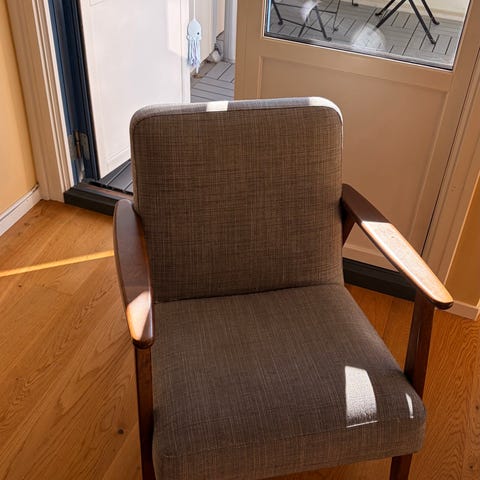 Fin stol. Brukt men i orden. Nyomtrukket ca 2017. Synlig merke på baksiden. Se bilde. Pute og saueskinn medfølger ikke. Må hentes på Grim