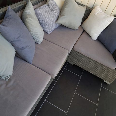 Selger vår pent brukte sofagruppe til uteplassen pga. flytting. Perfekt for terrasse, balkong eller hage!