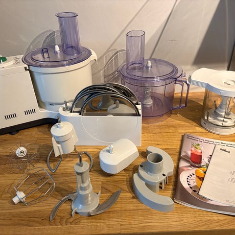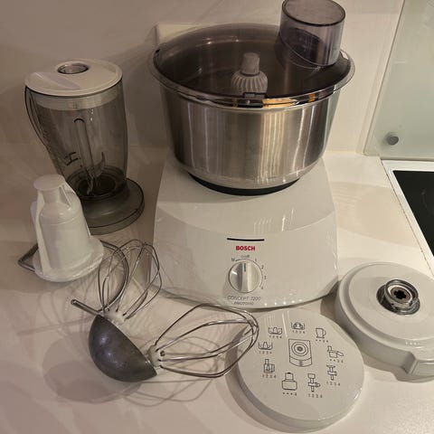 Bosch kjøkkenmaskin med tilbehør fint brukt! Maskinen har hovedenhet med bolle og lokk, samt ekstra arbeidsbolle med ulike visper og kniver for hakking, røring og elting. Passer til matlaging og baking på kjøkkenet, med flere deler som kan brukes til ulike oppgaver som kutting, blanding og visping.