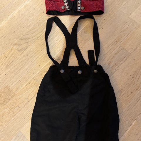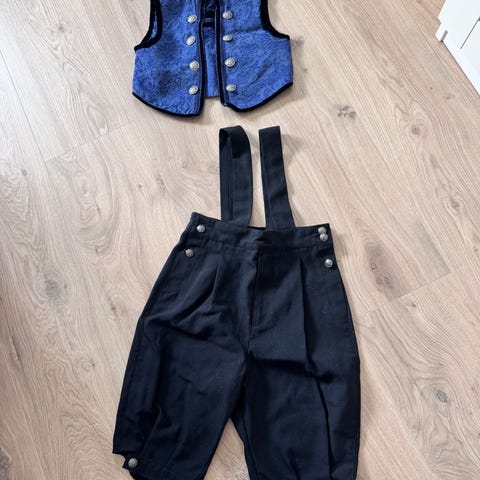 Reflex Eidsvoll mørk blå bunad i ullblanding med blomsterbroderier i størrelse 122. Sett bestående av vest og knebukse med seler. Vesten har knappelukking foran, to frontlommer og brodert detalj på krage og rygg. Buksen har knapper i siden og nederst på bena, samt justerbare seler.