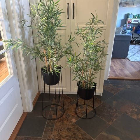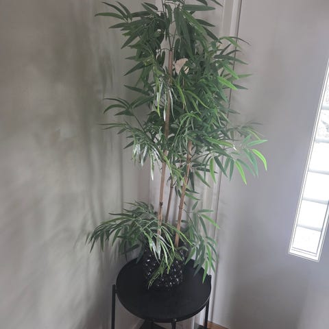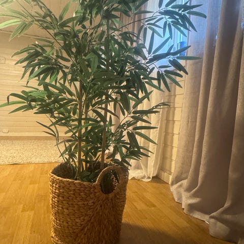 IKEA kunstig plante i bambus-stil i grønn farge. Planten står i potte og har flere stammer med smale, grønne blader. Egnet som dekorasjon innendørs i stue, gang, kontor eller andre rom der man ønsker et plantepreg uten behov for stell. Kan plasseres på gulv eller i større potte/kurv for ønsket uttrykk.