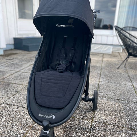 Baby Jogger barnevogn i svart. Vognen har justerbar rygg, stor kalesje og fempunktssele. Understellet har tre hjul og romslig varekurv under setet. Det følger med frontbøyle med brett og koppholder, originalt regntrekk og organizer til å ha småting lett tilgjengelig for den som triller.