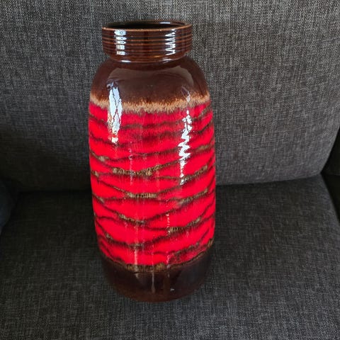 Vintage vest-tysk keramikkvase (West German Pottery) med typisk "lava"-glasur i blått og brunt.