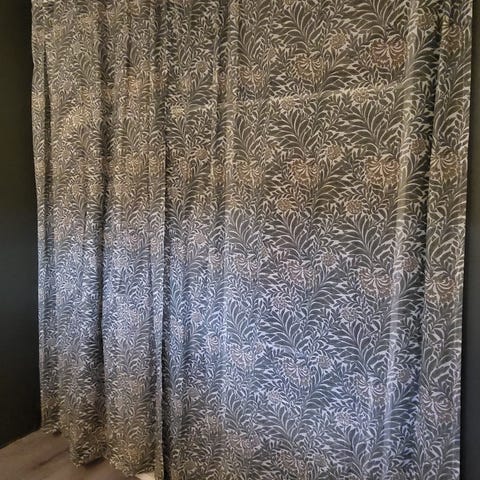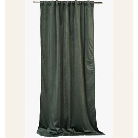 2 stk lystette gardiner i lys grønn. De har påsydd multifunksjonsbånd sånn at de kan henges fra både stang og skinne.