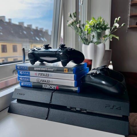 Sony Playstation 4 og playstation 3 spillkonsoll med håndkontroll og spill