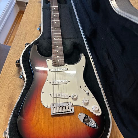 Fender Stratocaster elektrisk gitar i sunburst-finish. Gitaren er i veldig god stand og helt fantastisk å spille på. Den selges siden jeg ikke bruker den mer.