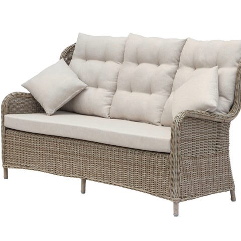 Hagesofa huske i metall i hvit farge. Rammen er laget av metallrør, og setet har nettingmønster i metall. Egnet for bruk i hage, på terrasse eller uteplass. Passer for flere personer avhengig av setebredde og vektbegrensning. Leveres uten puter eller tak etter det som vises på bildene.