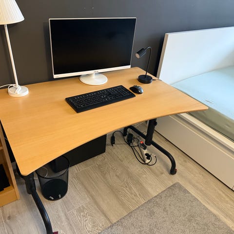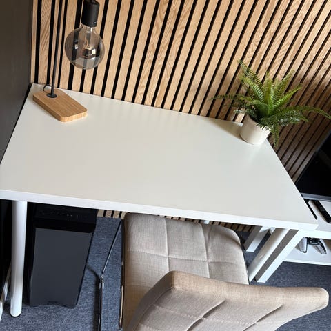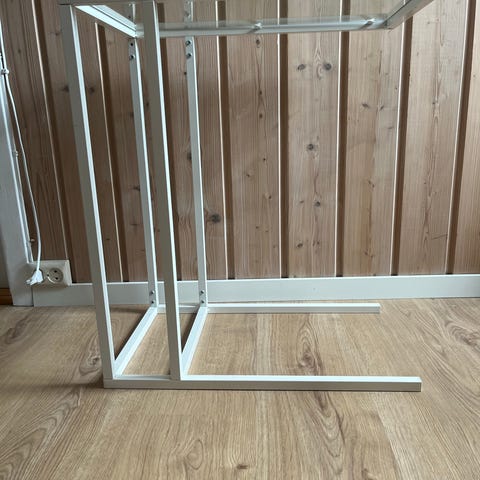 Stilrent og moderne skrivebord med hvit metallramme og glassplate. Passer perfekt til hjemmekontor eller studier, og tar lite plass samtidig som det gir et luftig uttrykk i rommet.