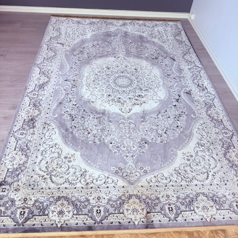 IKEA Vedbåk teppe i rektangulær form med orientalskinspirert mønster i grå og beige toner. Teppet har sentralt medaljongmønster og dekorativ bord rundt kantene. Passer til bruk i stue, spisestue eller andre oppholdsrom. Materiale og nøyaktige mål fremgår av etiketten på produktet.