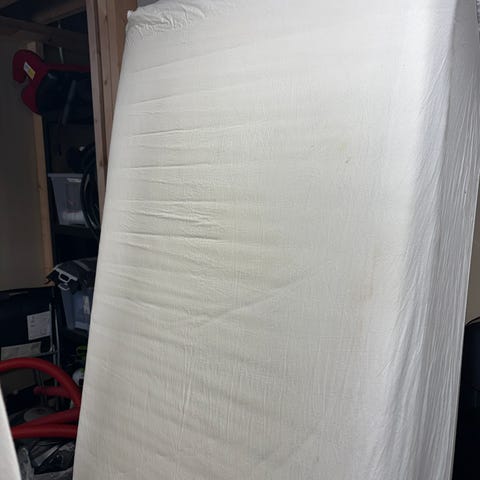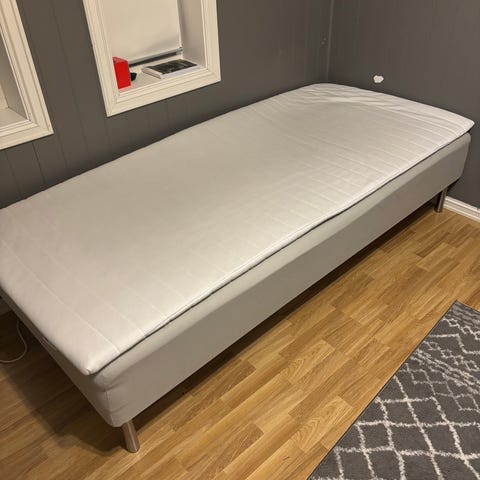 Sengen har en enkel, rett ramme med rette ben og en lys madrass oppå. Passer som enkeltseng på soverom, gjesterom eller under trapp der det er begrenset plass. Egnet for én person. Madrassen er tynn til middels tykk og ligger løst på sengerammen.