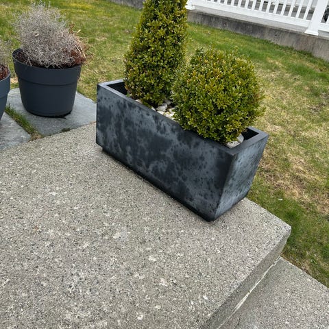 Hvit firkantet blomsterkasse med utvendig mål på ca. 40 x 40 cm. Kassen har rett, moderne form. Egner seg for planting av busker, stauder eller mindre trær på terrasse, balkong eller i hage. Materialet fremstår som hard plast eller kompositt egnet for utendørs bruk. Leveres uten planter.