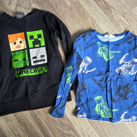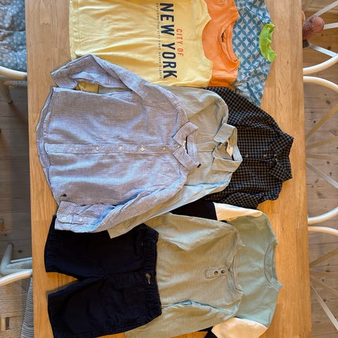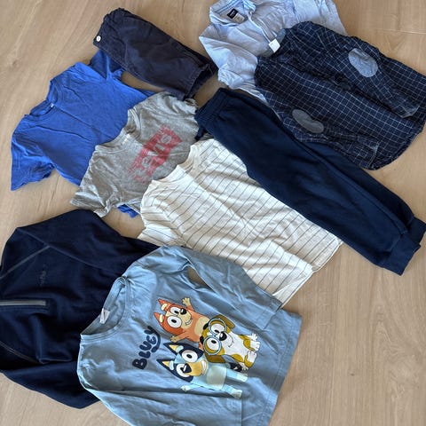 Klespakke med klær i strl 116 og 122/128. Mest er i strl 116. I pakken er 7 stk skjorter, 13 stk t-skjorter, 11 stk gensere, 7 stk tynne gensere, 3 stk shorts, 4 stk pysj gensere, 1 stk joggedress, 1 bergans turbukse, 1 olabukse, 1 joggebukse, 1 fleece sett, 1 tynn treningsgenser. Noen små hull i noen av plaggene