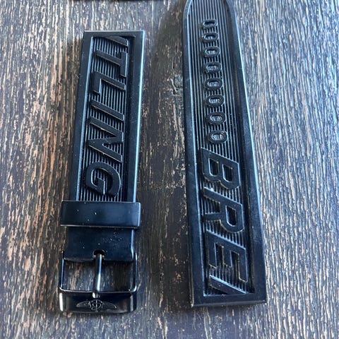 Breitling klokkerem i gummi for unisex. Remmen består av to deler med spenne og justerbare hull for tilpasning rundt håndleddet. Fargen fremstår som svart, og overflaten har strukturert mønster og preget Breitling-logo. Kommer med spenne. 20mm