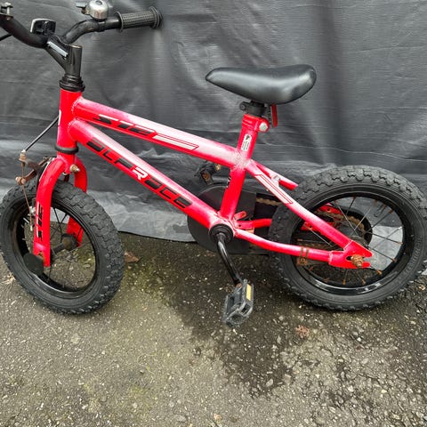 Diamant barnesykkel med 12" hjul i rød og gul farge. Ultra serien har spesielt lett ramme for enklere håndtering av små barn. Den har lav innstigning for de små og passer kanskje 3-5 åringer. Pedalbremse for bakhjulet og håndbremse til forhjulet